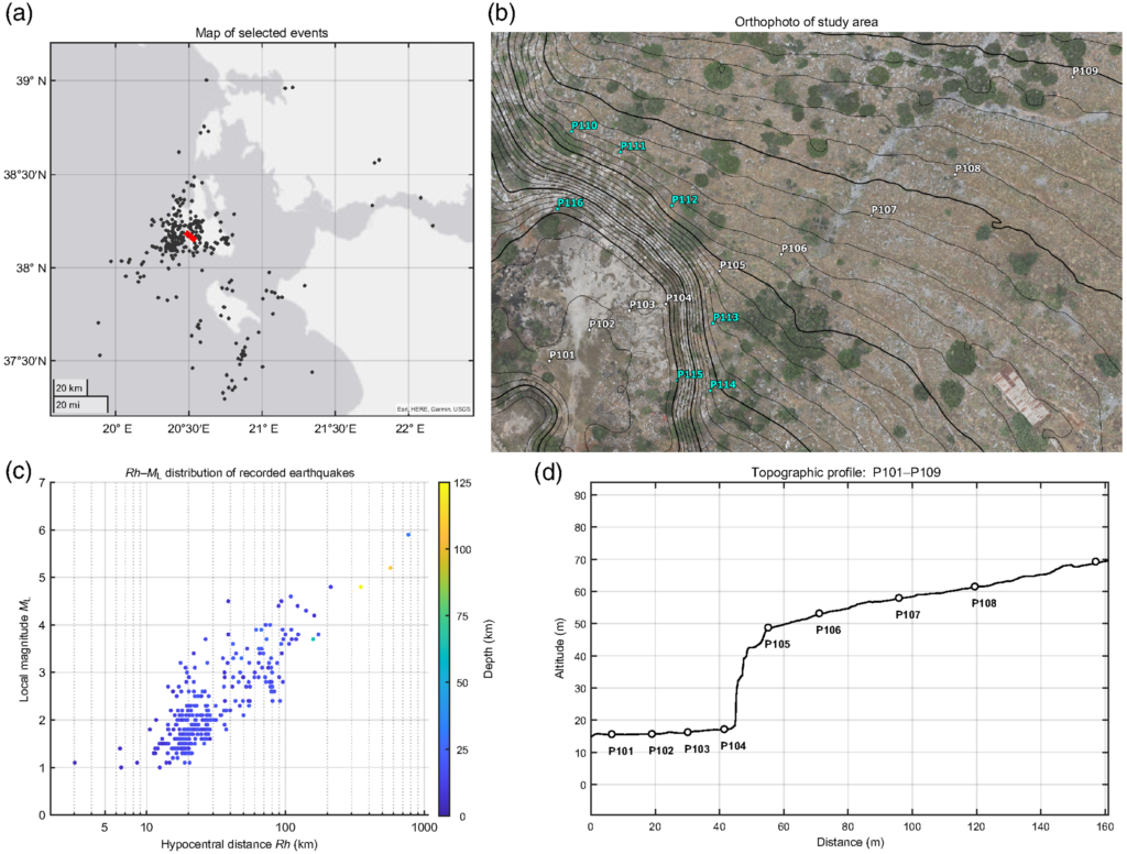 Title: Effects of Topography on Ground‐Motion Recordings at Short Wavelengths: The Case of a Cliff in Cephalonia, Western Greece. Key points: Topography effects on ground motion are examined at the top and base of a 30‐m cliff. Cliff base de‐amplifications exceed top amplifications, especially between 5 and 15 Hz. Stations near cliffs can bias ground‐motion models and lead to inaccurate seismic hazard estimates.
